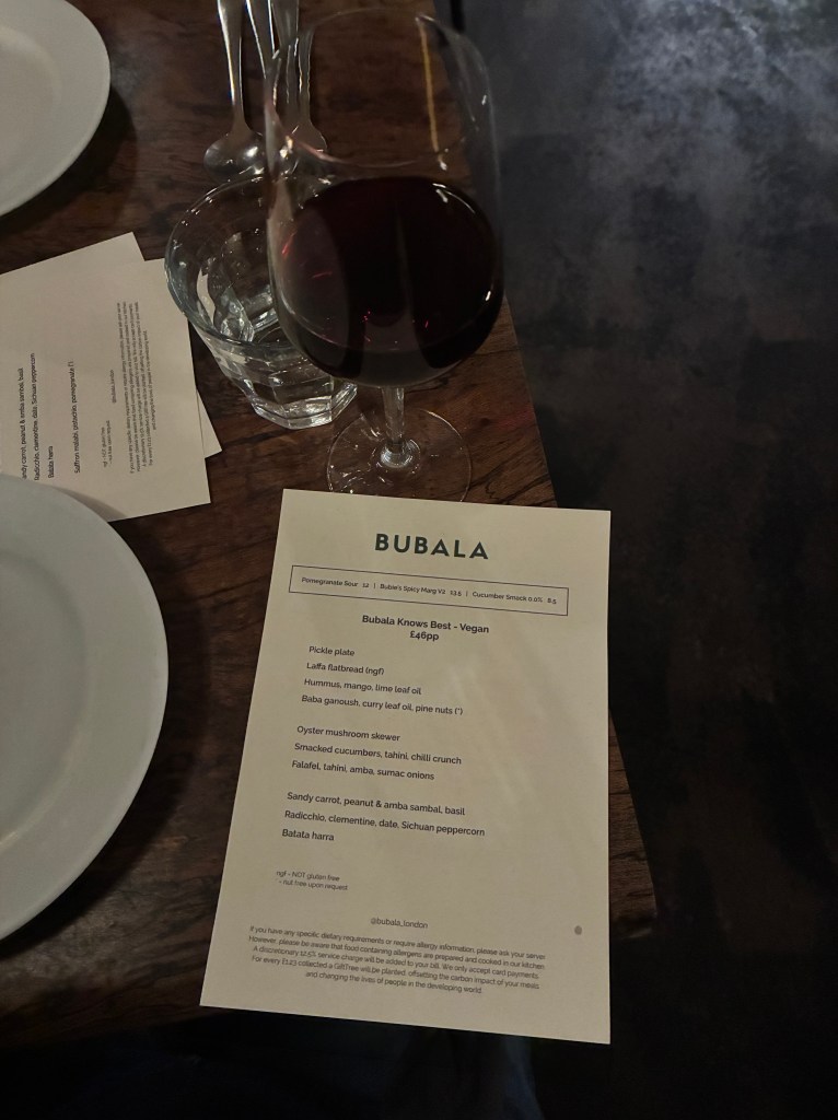 So Jim’s BFF Hillari sent us a gift card to BUBALA for Christmas. We figured they would have a few vegan or veggie items. We arrived to this super-packed place to find out the entire menu is vegan and vegetarian. They even have a vegan tasting menu and because it’s the holidays, a vegan holiday tasting menu. They also have an a la cart menu where you can pick from small to larger shared plates. Tons of options – YES – we LOVE tons of options, don’t we?