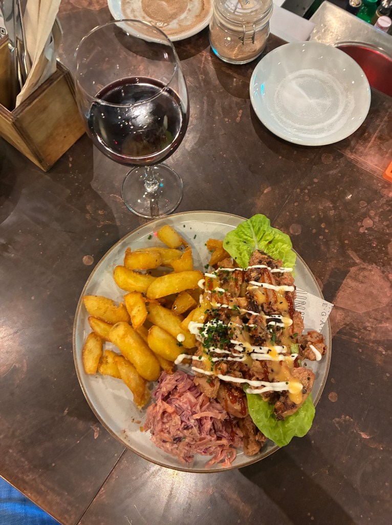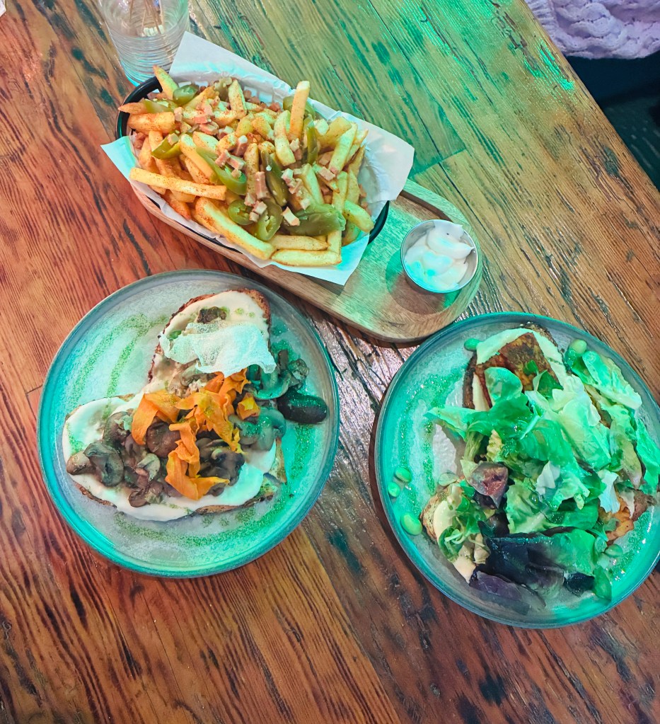 Steve had the THERE WON’T BE MUSHROOM LEFT – partly because he appreciates a good pun – so tasty with mushrooms over butter bean dip and miso sauce, crunchy crisps of potato shavings on top of toasted bread. YUM.