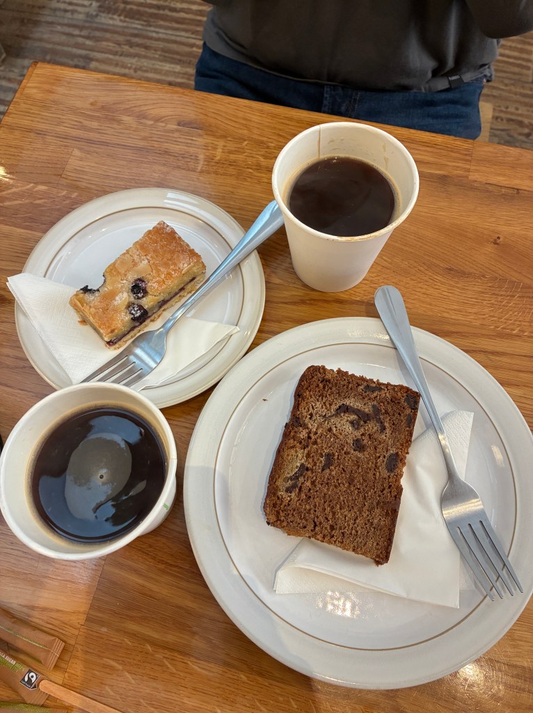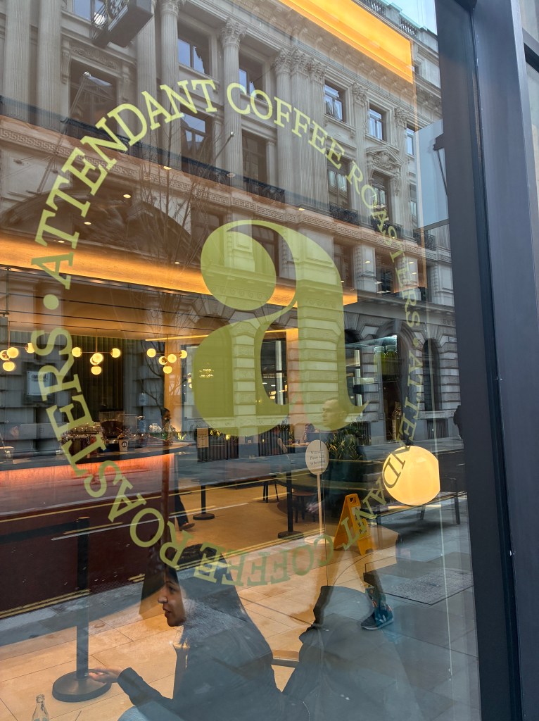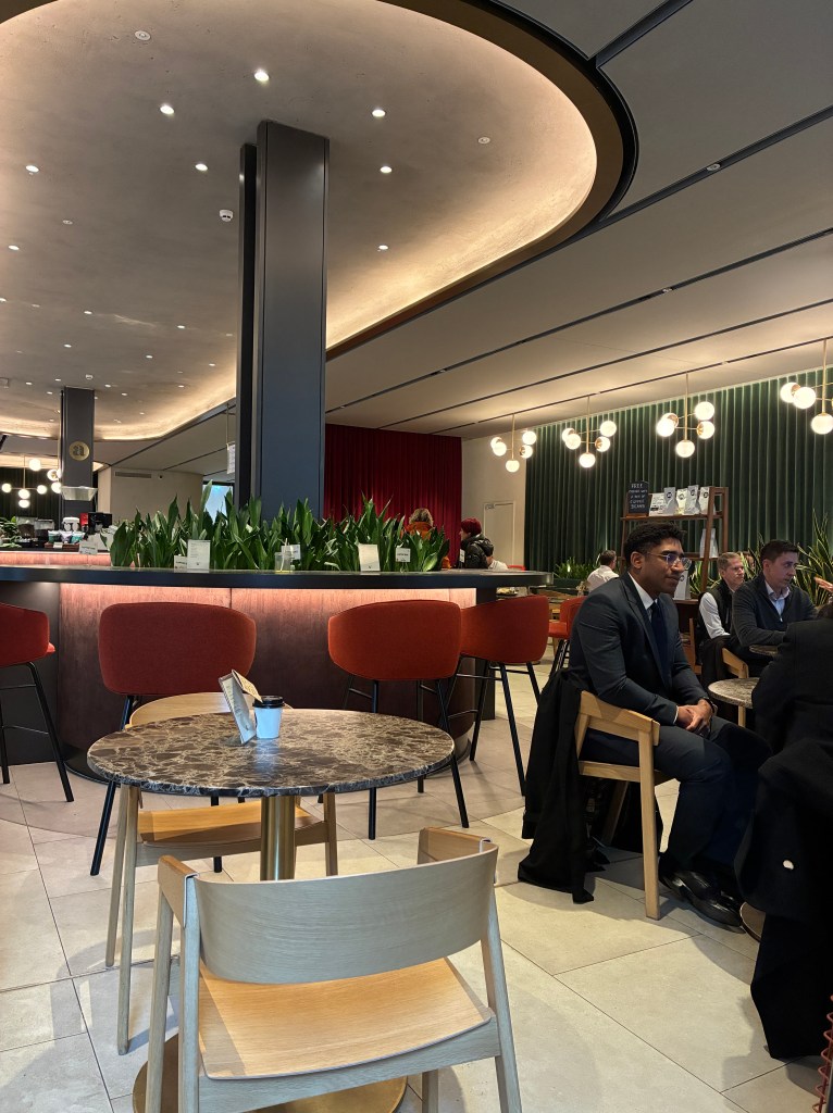 We were out and about right off the Elizabeth line at Liverpool St, when we were both craving a cup o’ Joe and something sweet and we happened upon this place. It’s in the heart of the financial district, a lot of fancy dressed working people. Coffee was super strong and the vegan carrot cake and double chocolate cake delivered. Great place to people watch while you caffeine and sugar it up.