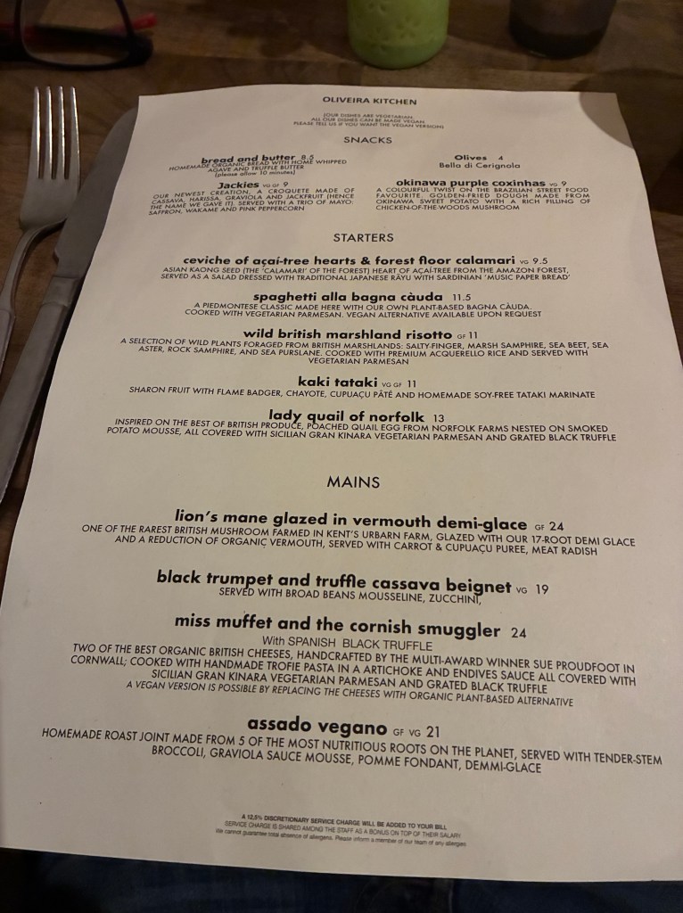 Jim took me on an early Valentine’s secret dinner to OLIVERIA KITCHEN where they have a full vegetarian/vegan menu. Everything on it can be made to order vegan, so you and your friends are covered. This place is the definition of ‘swank,’ super modern in style and decor. And the owner/head chef Emerson Amélio de Oliveira could not be more friendly, hilarious, and thoughtful if he tried. He personally greeted us at our table to welcome us.