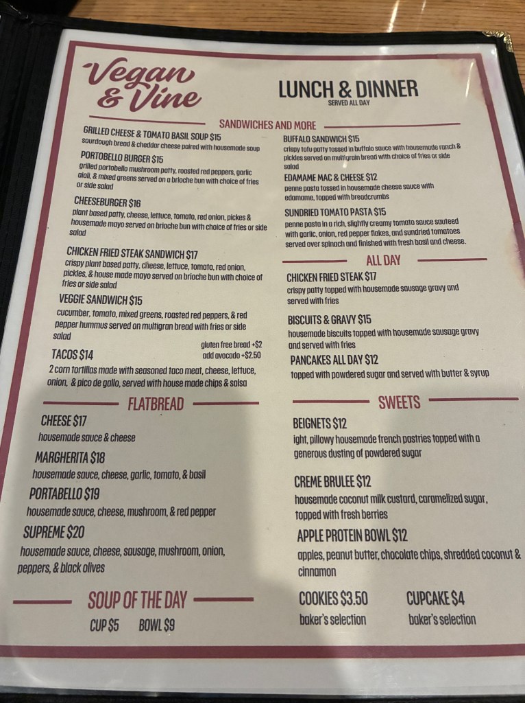 Recently traveling to the Phoenix area, VEGAN & VINE came recommended to us from a friend and my mom also heard about it on a radio show. To clarify: my mom heard about the creme brulee (apologies to any French readers for the lack of punctuation) on the radio show, which is pictured above and let me say does not disappoint. I asked our server, who happened to be the co-owner, if they used aquafaba (OK fine, I’ll admit I said ‘chickpea water’ haha) to mimic the egg/creme texture and her eyes went huge, “How do you know that??” was her response. I shrugged and said, “M’yeh, I know some stuff” (I don’t know how to change a tire but I know about aquafaba).