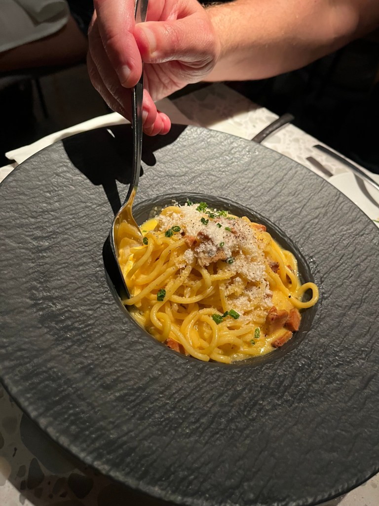 We each started with a glass of white wine and their Olive and Rosemary Bread. Perfect start, perfect landing. We moved on to a glass of red wine and their Puttanesca Meatballs, again, nailed it. For our dinner, we were like, well, we’ve already had some wine and the delicious bread and meatballs, let’s just order something to share. So we got the Spaghetti Carbonara and the Hot Honey Pizza because clearly we have trouble saying no. And in this case, it was a damn good thing: