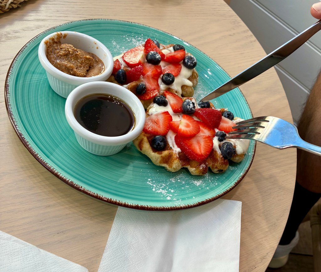 Vegan Waffles with fresh fruit, dairy free yogurt and maple syrup. Pro-tip: ask for a side of peanut butter to come with it – so good to have a little savory/salty accompany your bite of sweet.